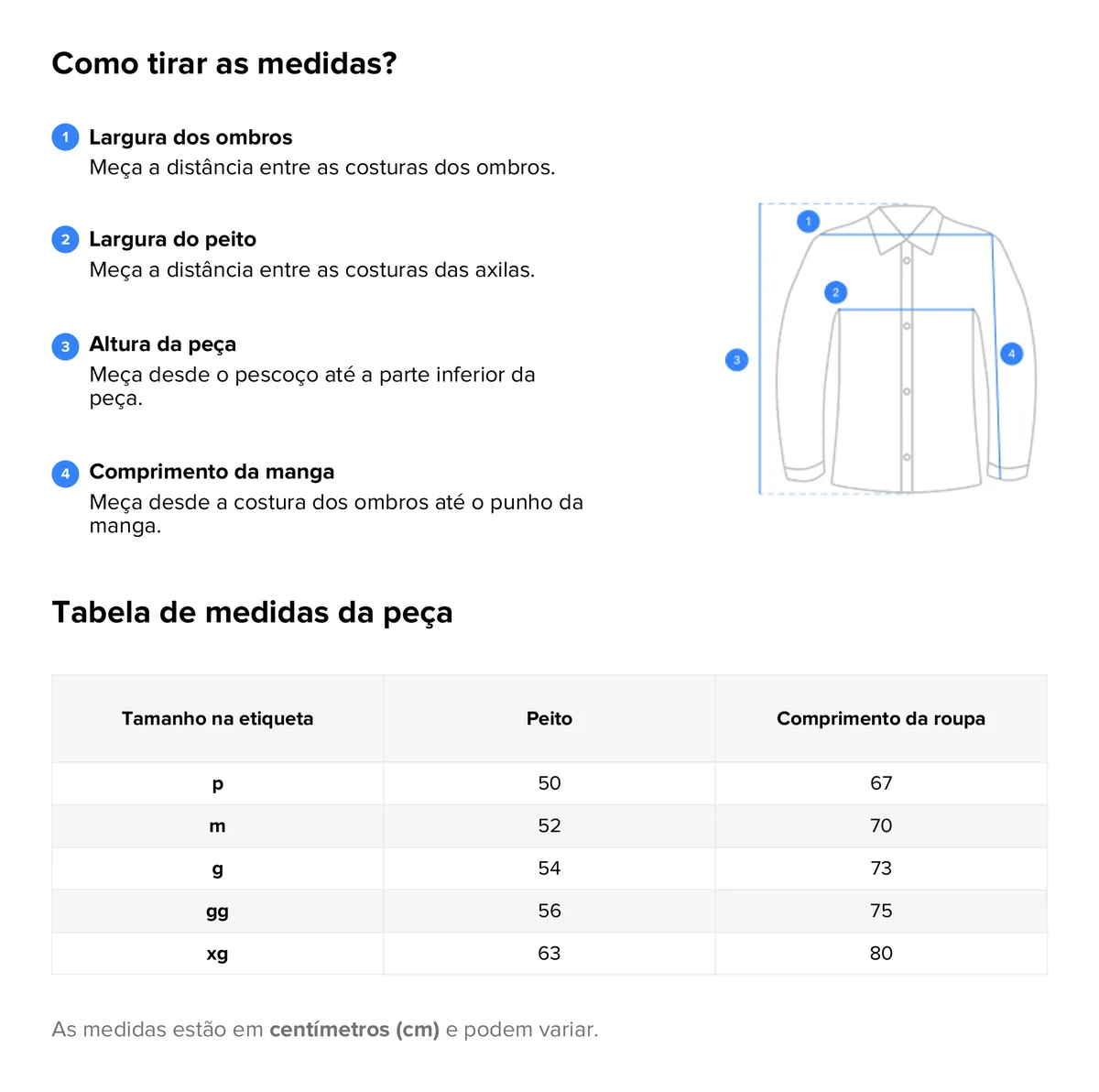 - P, M, G, GG, XGG (oversized fit, largura maior que o padrão)